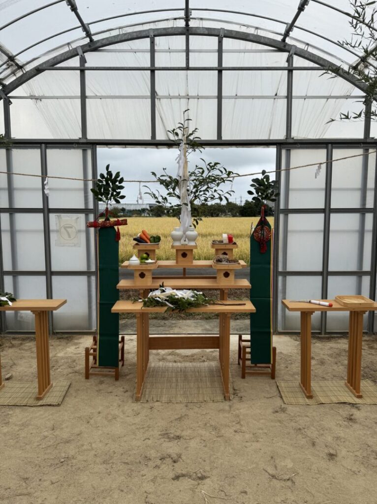 当日は、祭壇にお神酒・野菜・塩などを供え、修祓から祝詞奏上、玉串拝礼と次第が進行。参列者一同で頭を垂れ、稲作と酒造りの無事を祈念しました。厳かな空気のなか、地元に息づく神道行事と伊勢の酒造文化のつながりを体感できる貴重な機会となりました。