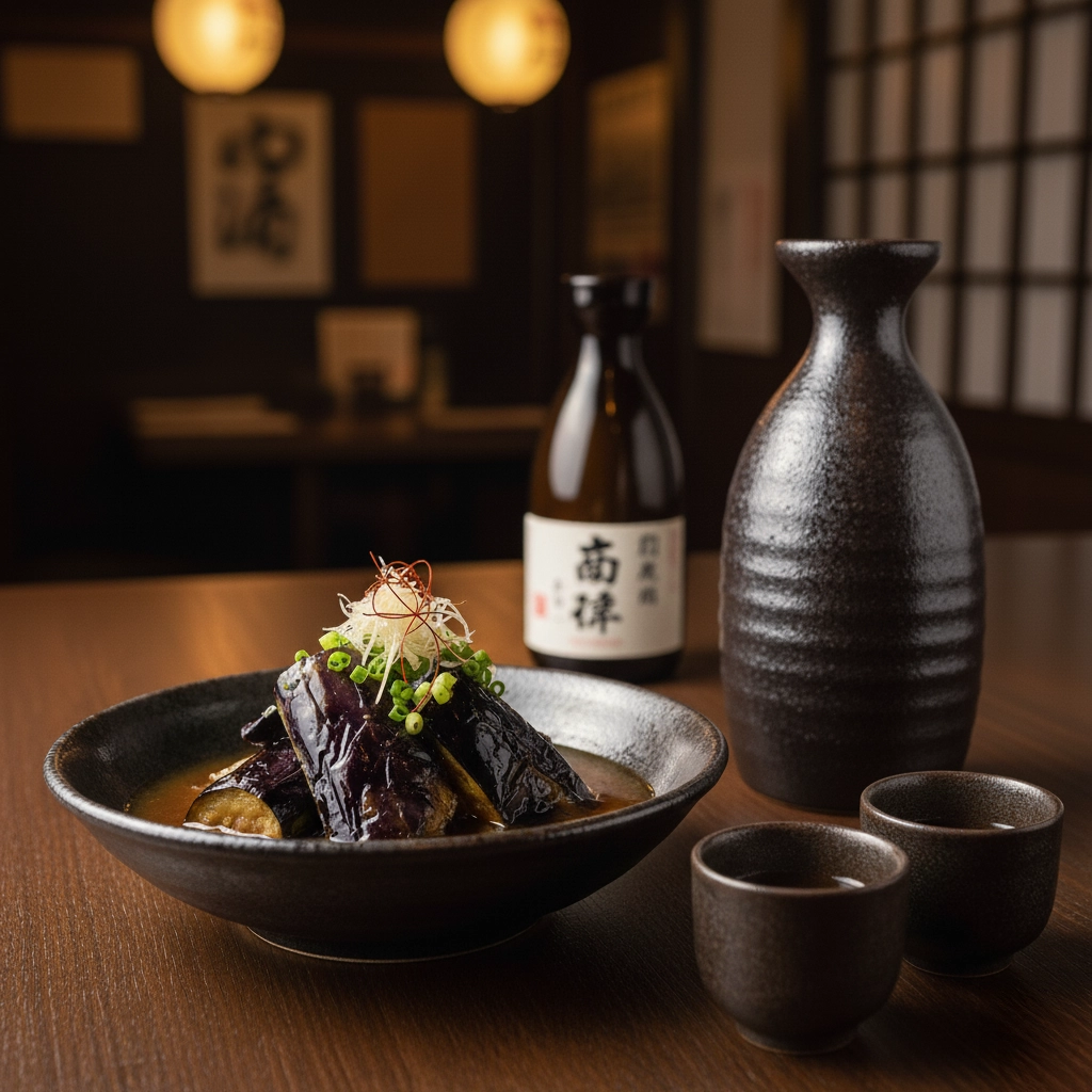 旨みの強い赤身に、キレのある酸と香りで口内をリセット。 - 秋なすの揚げ浸し × ひやおろし(常温)